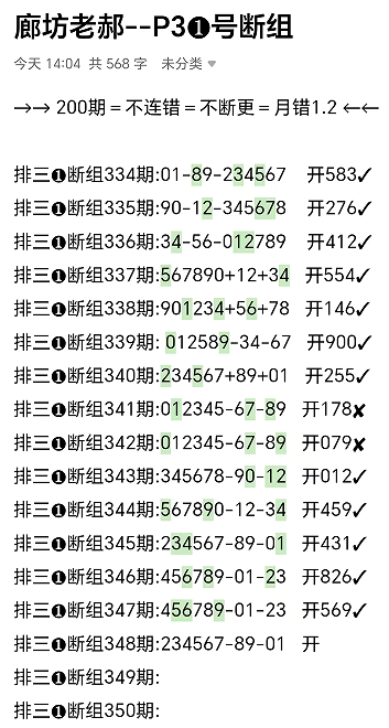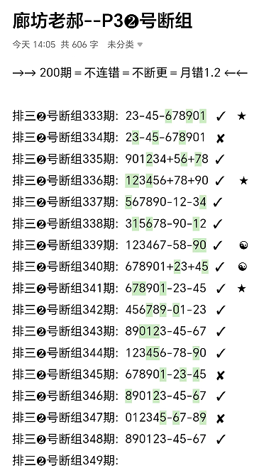 家人们好呀!我是彩虹号的签约作者【廊坊老郝】,专门研究彩票号码规律的。在数字这行摸爬滚打了十余年,总结出一套自己的分析方法。平时就爱研究规律与走势图和开奖号码,找那些反复出现的规律。认识我的人都知道,我的尾跨断组胆是拿手绝活,大底从100+到700+的战绩非常亮眼。