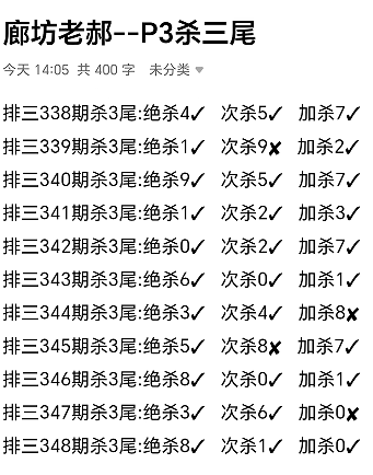 2.杀尾条件运用:本期给出的杀尾条件为810,首选第一杀为8尾,选号时可利用杀尾排除很多号码组合,缩小选号范围,根据自己的分析与我结合。
