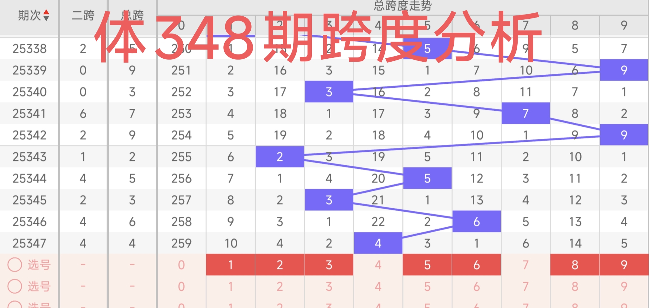 跨度作为衡量号码离散程度的核心指标,其走势变化对选号至关重要。依据近三十期的走势,第338期到第347期奖号对应的跨度依次是:5、9、3、7、9、2、5、3、6、4。近十期内,大跨度出现了6次,小跨度出现了4次,大跨度同样占据优势。