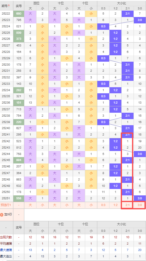 上期大小比:3:0,近10期大小比出现情况:1:2、1:2、3:0、2:1、1:2、1:2、2:1、1:2、2:1、3:0,最近10期出3期2:1,出现5期1:2,出现0期0:3,出现2期3:0,根据近10期出号规律本期看好大号,推荐连出3:0,防隔期开出2:1,综上所述大小比推荐:防:2:1,重点关注:3:0。