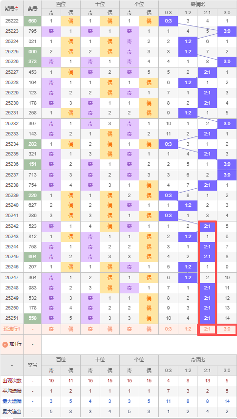 上期奇偶比:2:1,近10期奇偶比出现情况:2:1、1:2、2:1、2:1、1:2、1:2、2:1、2:1、2:1、2:1,最近10期出现7期2:1,出现3期1:2,出现0期0:3,出现0期3:0,根据近10期出号规律本期看好奇数,推荐遗漏14期的3:0,防五连出的2:1,综上所述奇偶比推荐:防:2:1,重点关注:3:0。