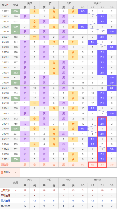 上期质合比:2:1,近10期质合比出现情况:3:0、2:1、2:1、0:3、2:1、1:2、1:2、3:0、2:1、2:1,最近10期出现5期2:1,出现2期1:2,出现1期0:3,出现2期3:0,根据近10期规律本期看好质数,推荐三连出2:1,防遗漏3期的1:2,综上所述质合比推荐:防:1:2,重点关注:2:1。