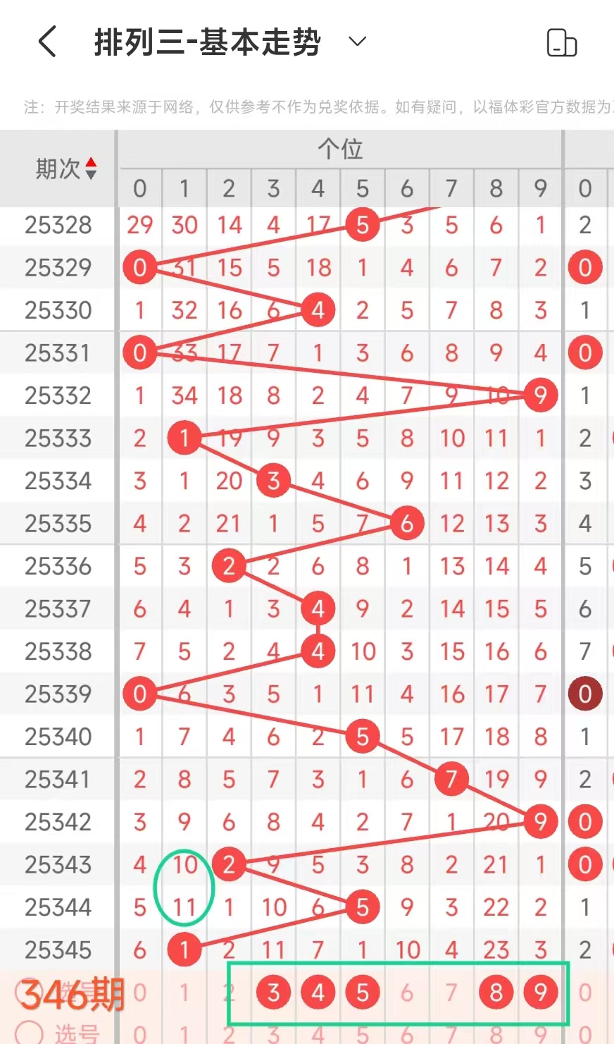 近10期开奖遗漏值分别 6 0 7 11 17 9 6 3 11,奇偶属性分别为:偶偶奇奇奇奇偶奇奇,奇后可能出奇,而奇数遗漏值的有34589,本期不妨考虑一下。