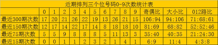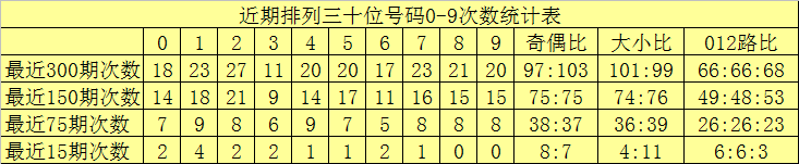 最近15期奖号由冷到热表现为:0、1→0次,2、3、7、9→1次,4、6→2次,5→3次,8→4次,奖号奇偶比为6:9,大小比为11:4,012路比为4:3:8。