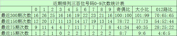 百位分析:最近300期奖号由冷到热表现为:0→21次,3→27次,4、9→28次,5→29次,6→30次,8→31次,2→33次,7→36次,1→37次,奖号奇偶比为157:143,大小比为154:146,012路比为106:101:93。