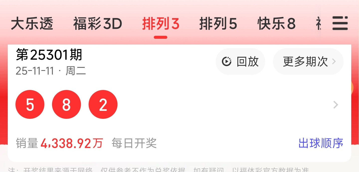 上期开出582,和尾为5,跨度为6,奇偶比为1:2,大小比为2:1012路个数对比为0:0:3