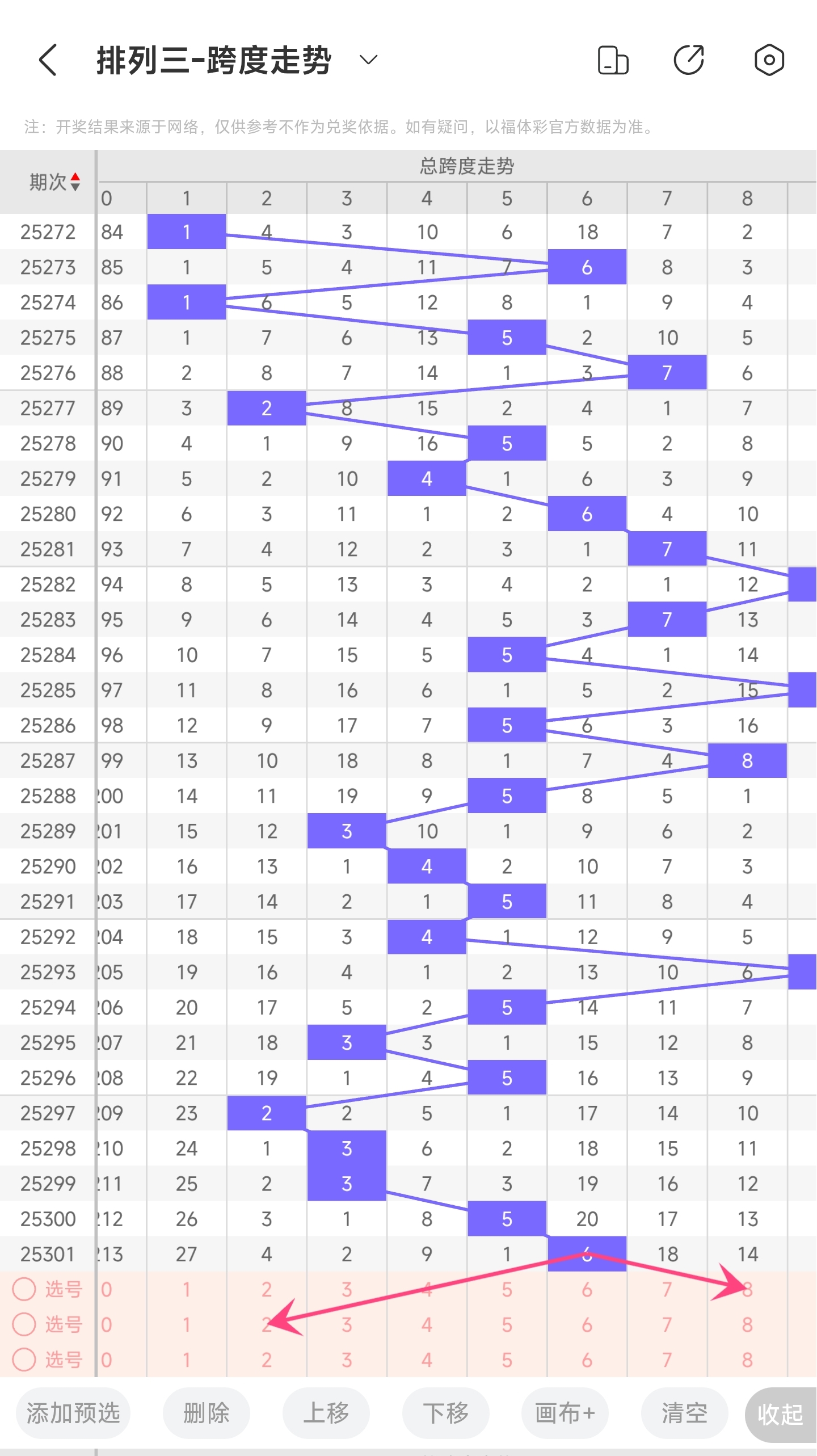 上期跨度为6,往前一期跨度是5,趋势往右移动,偏移量为1。跨度值6时,跨度值是近30期内开出中间位置的值。通过走势图分析,目前的趋势是可能往左也可能往右。所以推测本期跨度可能为23458等跨度。