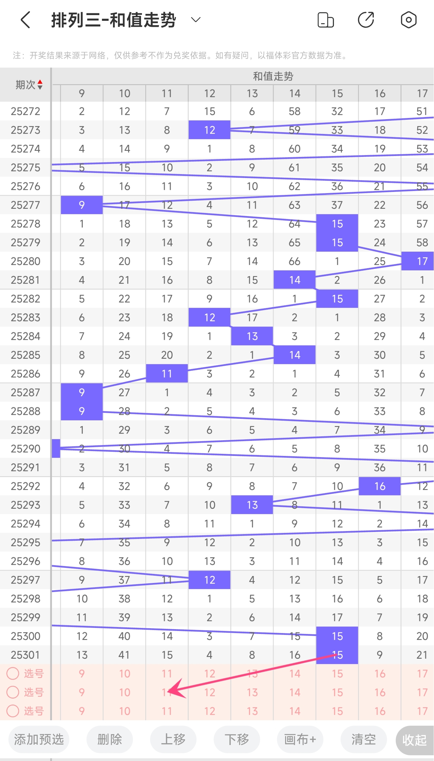 上期和值为15,往前一期和值为15,趋势没有移动,偏移量为0。通过走势图分析,15和值是近30期内开出的中间位置的和值,上升空间和下降空间差不多。所以趋势是可能往左也可能往右。本期看好小和值,因此推测本期趋势是往左的,和值会变小,小概率往右,和值变大。