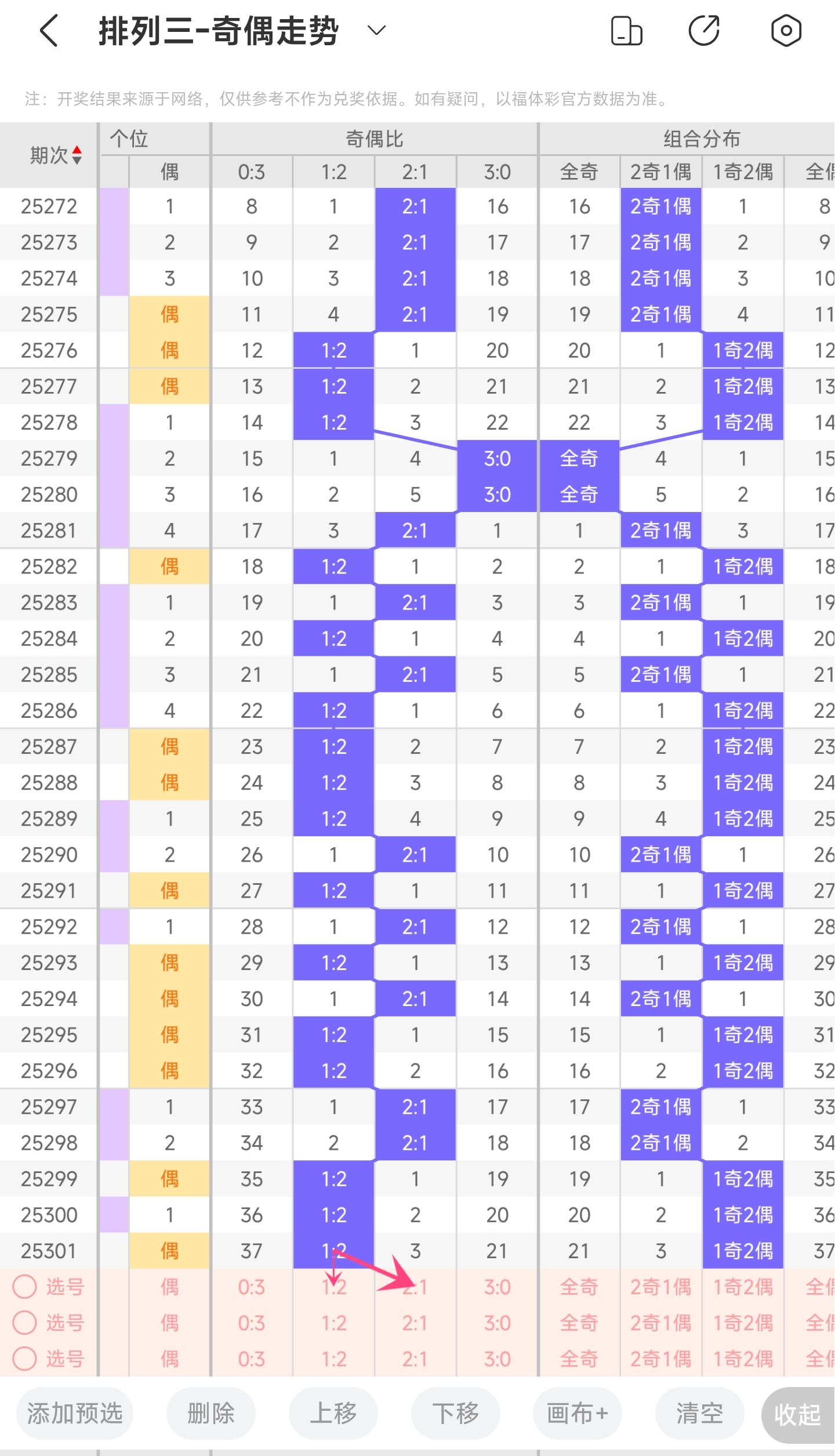 上期开出了1:2的奇偶比。往前一期是1:2奇偶比。通过分析奇偶走势图,近30期内开出1:2奇偶比的次数是16次,开出2:1奇偶比的次数是12次,3:02次,0:30次。和前一期相比,次数没有发生变化。通过走势图分析,可以就看到1:2奇偶比最热门,目前已经连出3期了,继续开1:2奇偶比的概率比较小,本期看好开其它类型。所以推测本期可能开2:1奇偶比,其次是1:2奇偶比,最后是3:0或者0:3奇偶比。