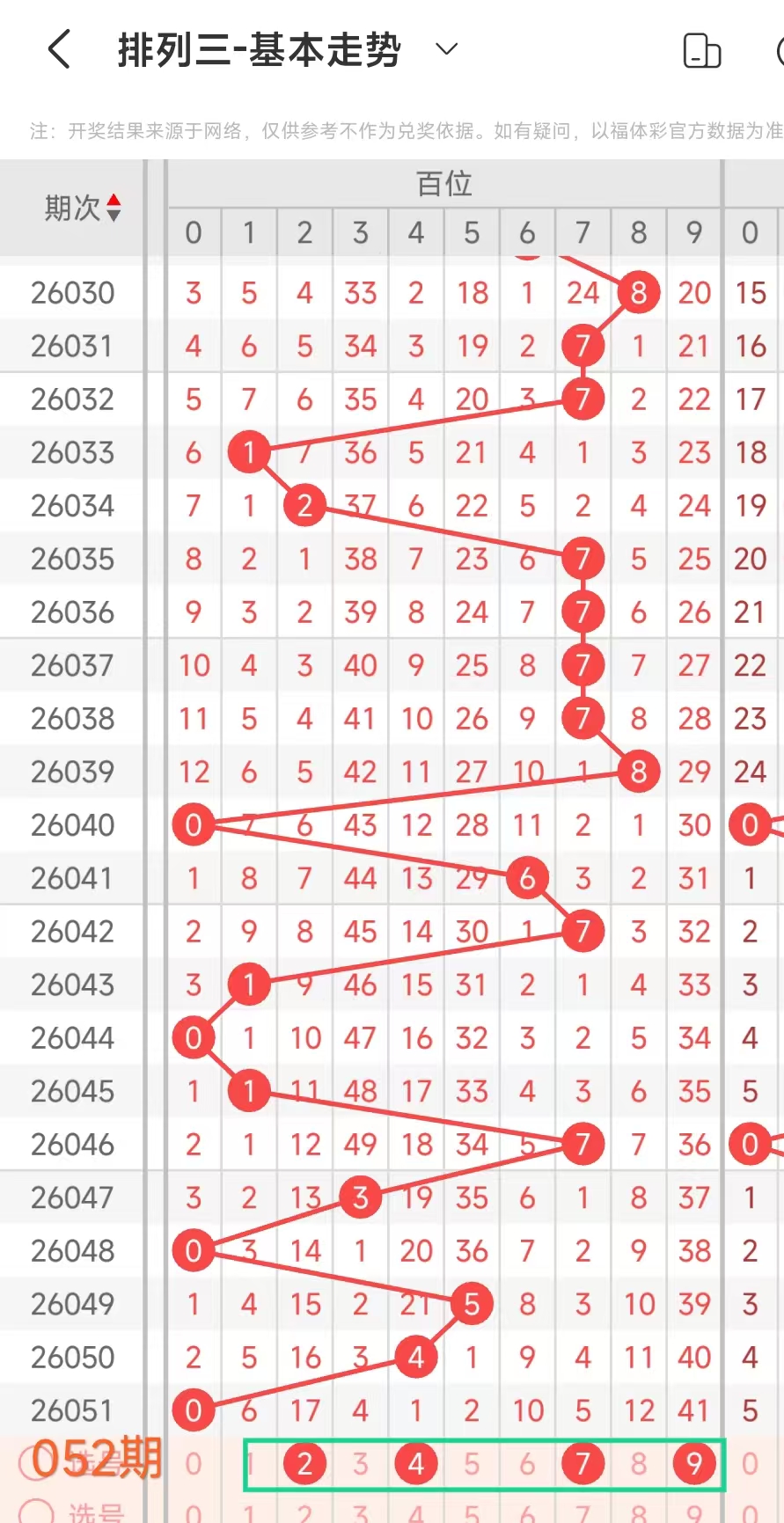 经统计0号出现6次、1号出现3次、2号出现7次、3号出现6次、4号出现4次、5号出7次、6号出现5次、7号出4次、8号出现6次、9号出现8次.统计后出现次数靠前的数字作为我们的备选号码.其号码有023589等