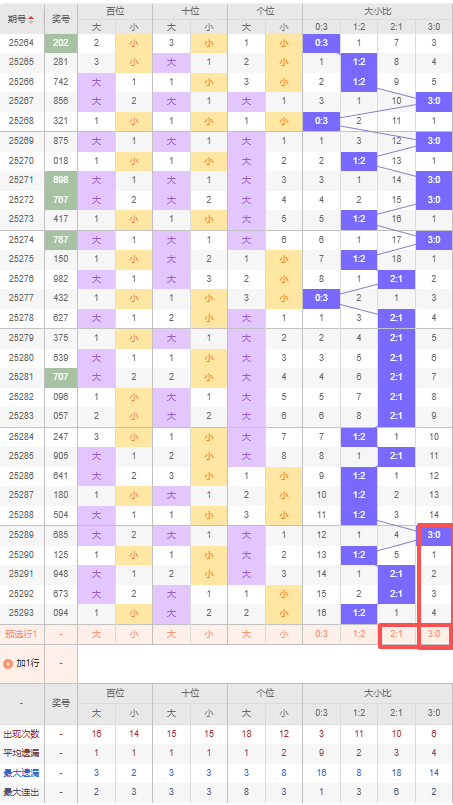 上期大小比:1:2,近10期大小比出现情况:1:2、2:1、1:2、1:2、1:2、3:0、1:2、2:1、2:1、1:2,最近10期出3期2:1,出现6期1:2,出现0期0:3,出现1期3:0,根据近10期出号规律本期推荐遗漏4期的3:0,防隔期出2:1,综上所述大小比推荐:防:2:1,重点关注:3:0。