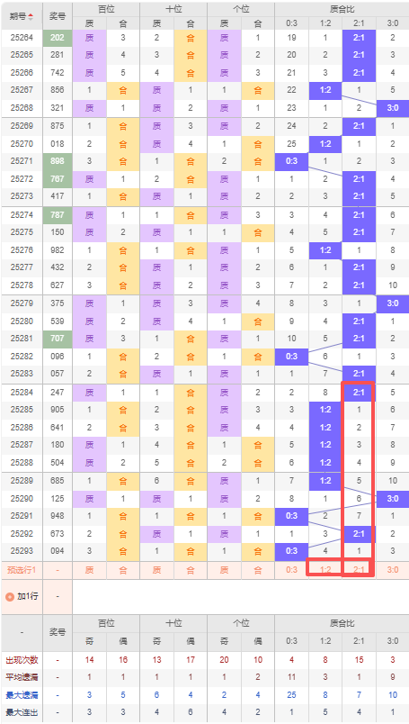 上期质合比:0:3,近10期质合比出现情况:2:1、1:2、1:2、1:2、1:2、1:2、3:0、0:3、2:1、0:3,最近10期出现2期2:1,出现5期1:2,出现2期0:3,出现1期3:0,根据近10期规律本期推荐遗漏4期的1:2,防隔期开出2:1,综上所述质合比推荐:防:2:1,重点关注:1:2