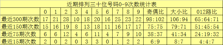 个位分析:最近300期奖号由冷到热表现为:921,0525,627,1831,2434,735,337次,该位号码奇偶比为149:151,大小比为139:161012路比为110:100:90