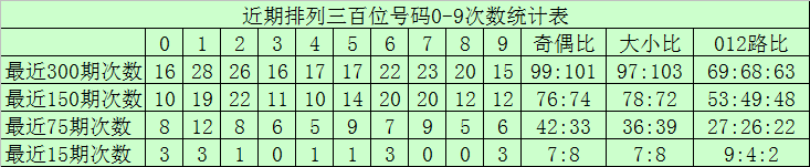 百位分析:最近300期奖号由冷到热表现为:019,426,527,8929,330,632,234,736,138次,奖号奇偶比为160:140,大小比为153147012路比为110:100:90