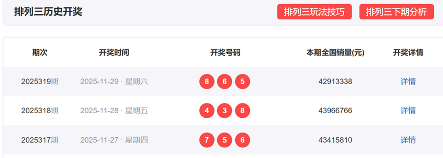 体彩排列3上一期,开奖号码为865,形态为组六,奇偶比为1:2,012路数值表现为202,和值19,和尾9,跨度3。