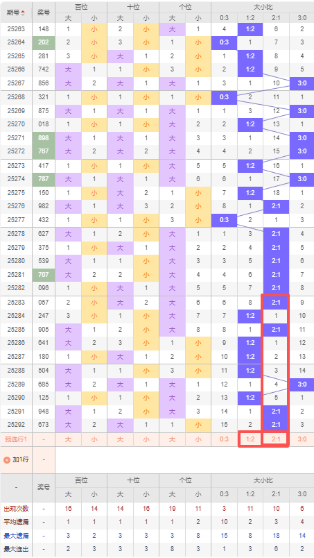 上期大小比:2:1,近10期大小比出现情况:2:1、1:2、2:1、1:2、1:2、1:2、3:0、1:2、2:1、2:1,最近10期出4期2:1,出现5期1:2,出现0期0:3,出现1期3:0,根据近10期出号规律本期推荐遗漏2期的1:2,防三连出2:1,综上所述大小比推荐:防:2:1,重点关注:1:2。
