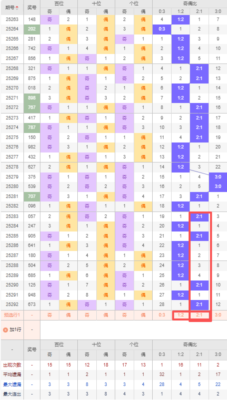 上期奇偶比:2:1,近10期奇偶比出现情况:2:1、1:2、2:1、1:2、1:2、1:2、1:2、2:1、1:2、2:1,最近10期出现4期2:1,出现6期1:2,出现0期0:3,出现0期3:0,根据近10期出号规律本期推荐看好隔期出1:2,防连出2:1,综上所述奇偶比推荐:防:2:1,重点关注:1:2。