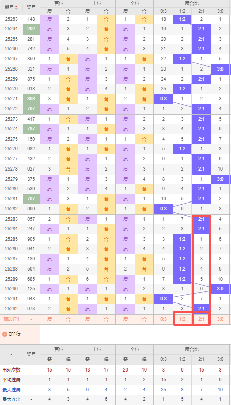 上期质合比:2:1,近10期质合比出现情况:2:1、2:1、1:2、1:2、1:2、1:2、1:2、3:0、0:3、2:1,最近10期出现3期2:1,出现5期1:2,出现1期0:3,出现1期3:0,根据近10期规律本期推荐连出2:1,防遗漏3期的1:2,综上所述质合比推荐:防:1:2,重点关注:2:1