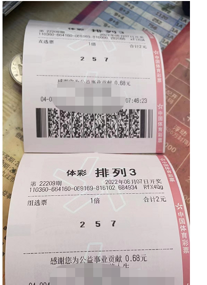 那么首先看到这张新鲜出炉的彩票,8月7日早上7点46打的,俗话说早起的鸟儿有食吃,买彩票也要积极,这张彩票是全质数号码,单选257,为什么会单挑这个号码,下面我会说说我理论的依据,根据理论要求,速度回到现实,那么就诞生了这张票样。