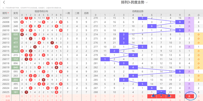 通过观察跨度及跨度属性走势可以发现:近10期内跨度开出大数号码后,下期容易连开大数号码,上期跨度开出了大数号码7,本期跨度大数号码继续出号可能性高,因此本期跨度选号时应该主要考虑大数号码,再结合上述走势图看,本期跨度看好678等号码。