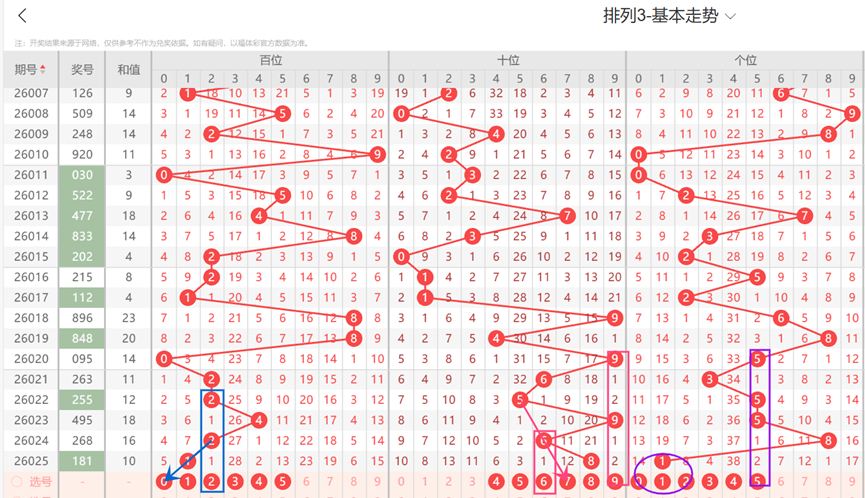 上一期百位开出号码为1,为奇数、小数、质数、1路号码:近10期百位较少开出67等号码,本期百位大概率仍然不会开出67等号码,因此本期百位选号时可以优先排除67等号码,结合上述走势图看,本期百位看好012345等号码。