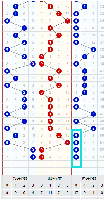 图表中数据我们必须要仔细观察下,上图是邻传孤的单选形态,我们可以看到近两期邻传孤都是300形态,这个300是什么意思呢?就是说明近期邻号连续开出3个,孤码和传码一个没有,这样的历史情况是不多见的。