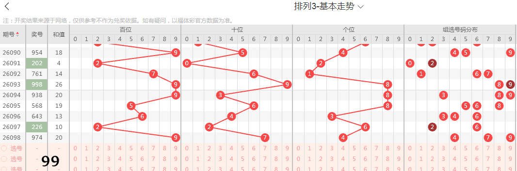 据上述规则,将近期百、十、个位开出的号码代入表格,过往数字走势便一目了然,见图示。