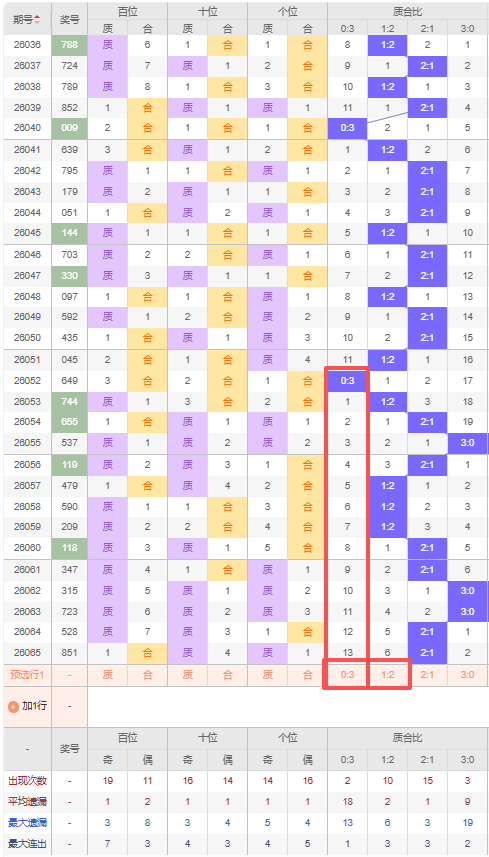 上期质合比:2:1,近10期质合比出现情况:2:1、1:2、1:2、1:2、2:1、2:1、3:0、3:0、2:1、2:1,最近10期出现5期2:1,出现3期1:2,出现0期0:3,出现2期3:0,根据近10期规律本期推荐遗漏6期出1:2,防遗漏13期出0:3,综上所述质合比推荐:防:0:3,重点关注:1:2。