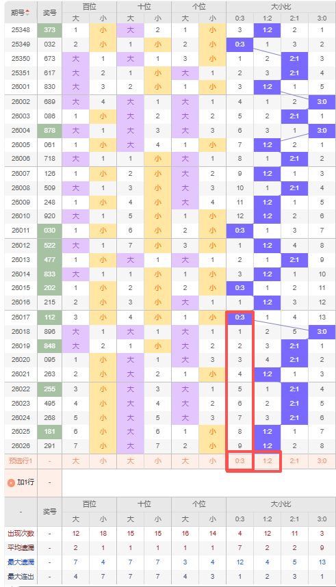 上期大小比:1:2,近10期大小比出现情况:0:3、3:0、2:1、2:1、1:2、2:1、2:1、2:1、1:2、1:2,最近10期出5期2:1,出现3期1:2,出现1期0:3,出现1期3:0,根据近10期出号规律本期推荐三连出1:2,防遗漏9期出0:3,综上所述大小比推荐:防:0:3,重点关注:1:2。