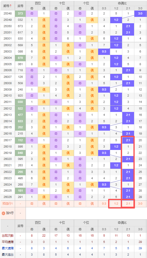上期奇偶比:2:1,近10期奇偶比出现情况:2:1、1:2、0:3、2:1、1:2、2:1、2:1、0:3、2:1、2:1,最近10期出现6期2:1,出现2期1:2,出现2期0:3,出现0期3:0,根据近10期出号规律本期推荐三连出2:1,防遗漏5期出1:2,综上所述奇偶比推荐:防:1:2,重点关注:2:1。