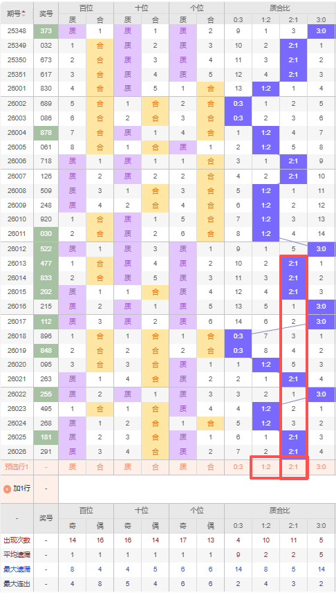 上期质合比:2:1,近10期质合比出现情况:3:0、0:3、0:3、1:2、2:1、3:0、1:2、1:2、2:1、2:1,最近10期出现3期2:1,出现3期1:2,出现2期0:3,出现2期3:0,根据近10期规律本期推荐遗漏2期出1:2,防三连出2:1,综上所述质合比推荐:防:2:1,重点关注:1:2。