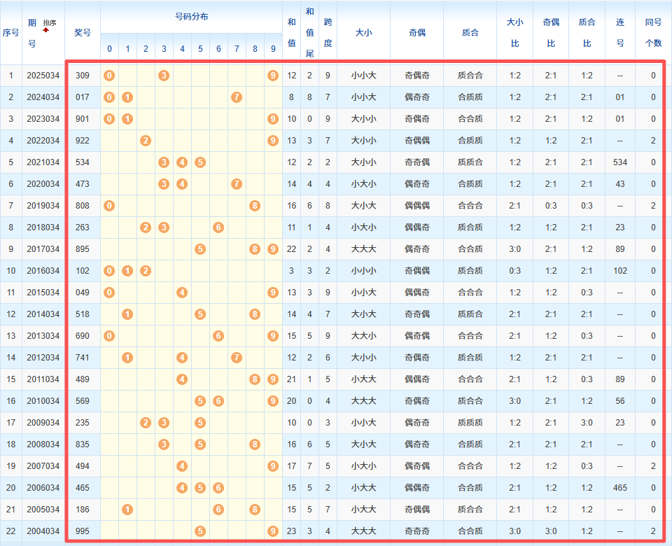 1、统计往年同期开奖号码