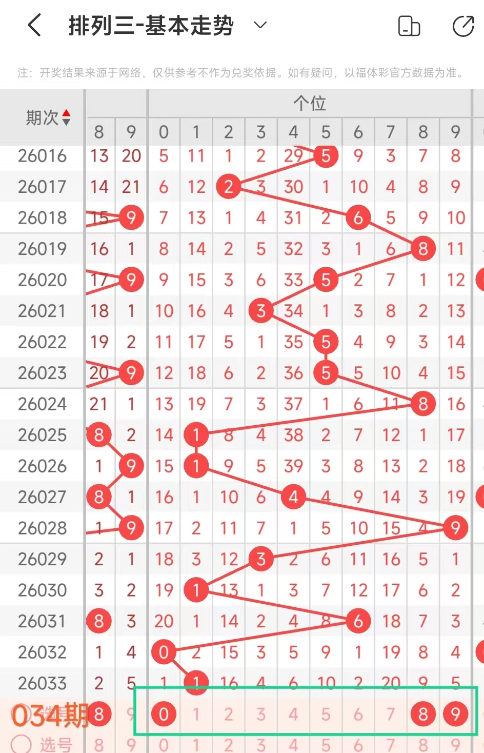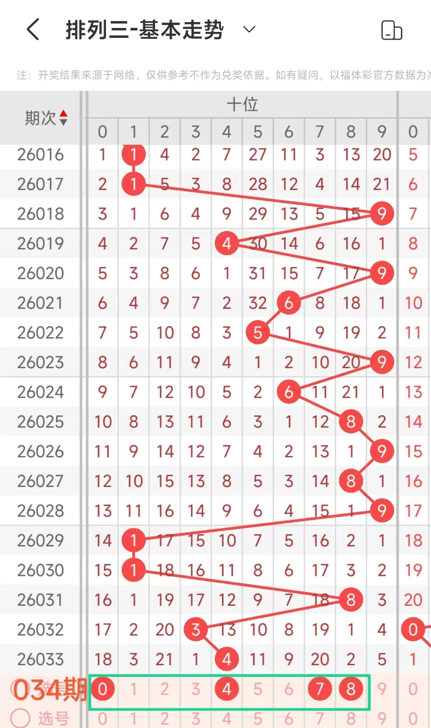 经统计0号出现7次、1号出现6次、2号出现4次、3号出现6次、4号出现7次、5号出8次、6号出现5次、7号出3次、8号出现6次、9号出现10次.统计后出现次数靠前的数字作为我们的备选号码.其号码有034589等