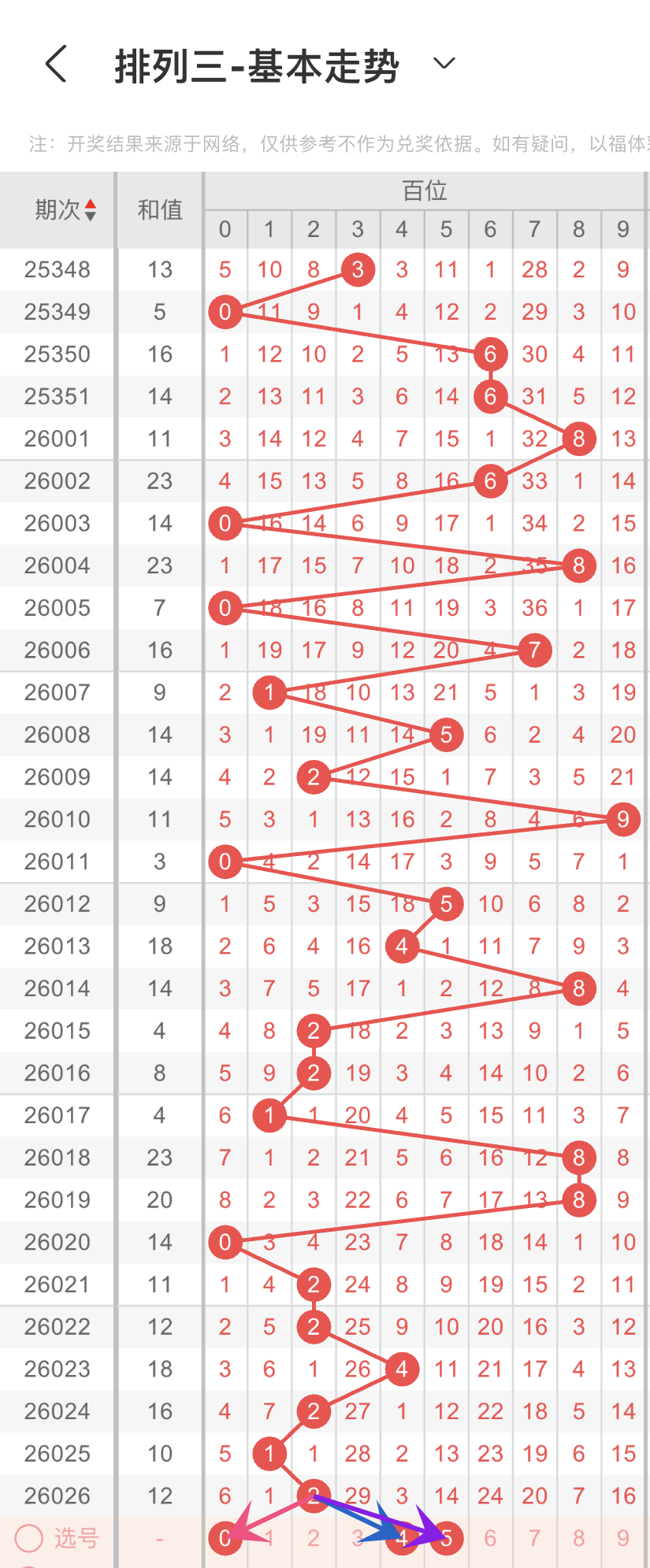 结合上面的大小、奇偶以及012路比,我们可以得到的数据分别是第一组56789,第二组13579,第三组258,我们重点选择3组数据中重复的,那百位我们选择5,0路的0,1路的4,,综上所述百位选045