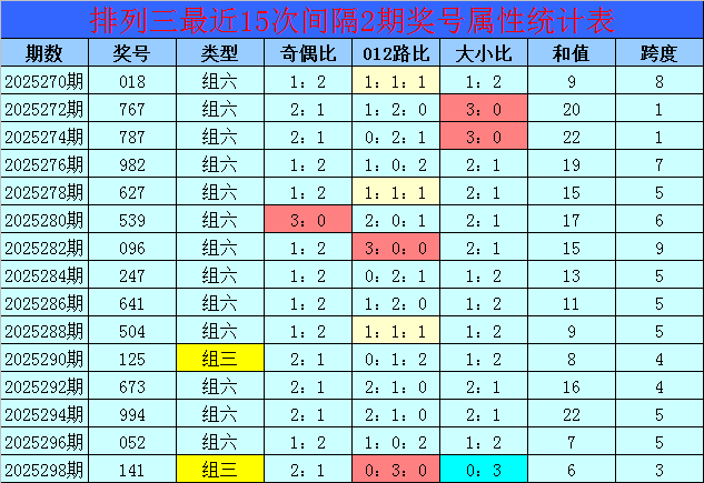 排列三第2025298期奖号为141,奖号组选类型为:组三,012路比为0:3:0,奇偶比为2:1,大小比为0:3,和值开出6,跨度开出3。