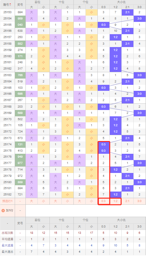 上期大小比:1:2,近10期大小比出现情况:2:1、0:3、0:3、2:1、3:0、1:2、2:1、3:0、2:1、1:2,最近10期出4期2:1,出现2期1:2,出现2期0:3,出现2期3:0,根据近10期出号规律本期看好小号,推荐遗漏7期出0:3,防连出1:2,综上所述大小比推荐:防:1:2,重点关注:0:3。
