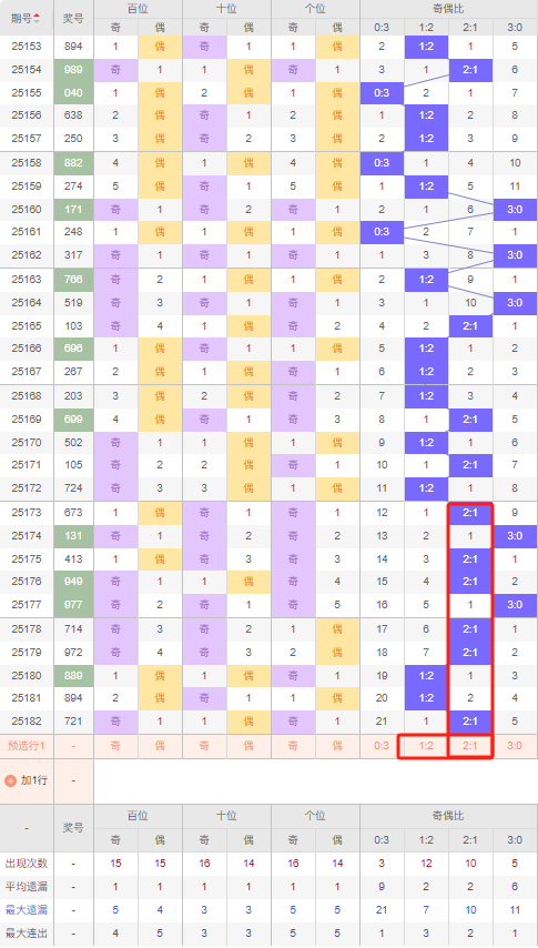 上期奇偶比:2:1,近10期奇偶比出现情况:2:1、3:0、2:1、2:1、3:0、2:1、2:1、1:2、1:2、2:1,最近10期出现6期2:1,出现2期1:2,出现0期0:3,出现2期3:0,根据近10期出号规律本期看好偶数,推荐隔期开出1:2,防连出2:1,综上所述奇偶比推荐:防:2:1,重点关注:1:2。