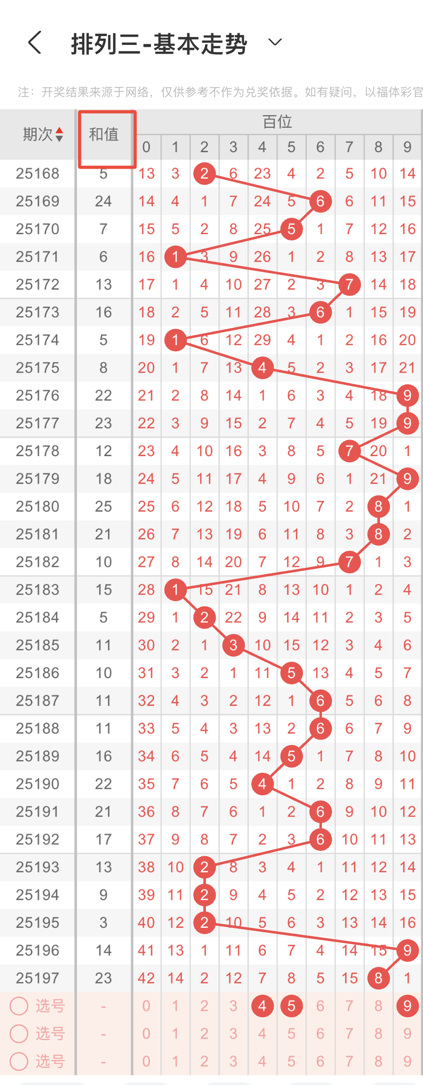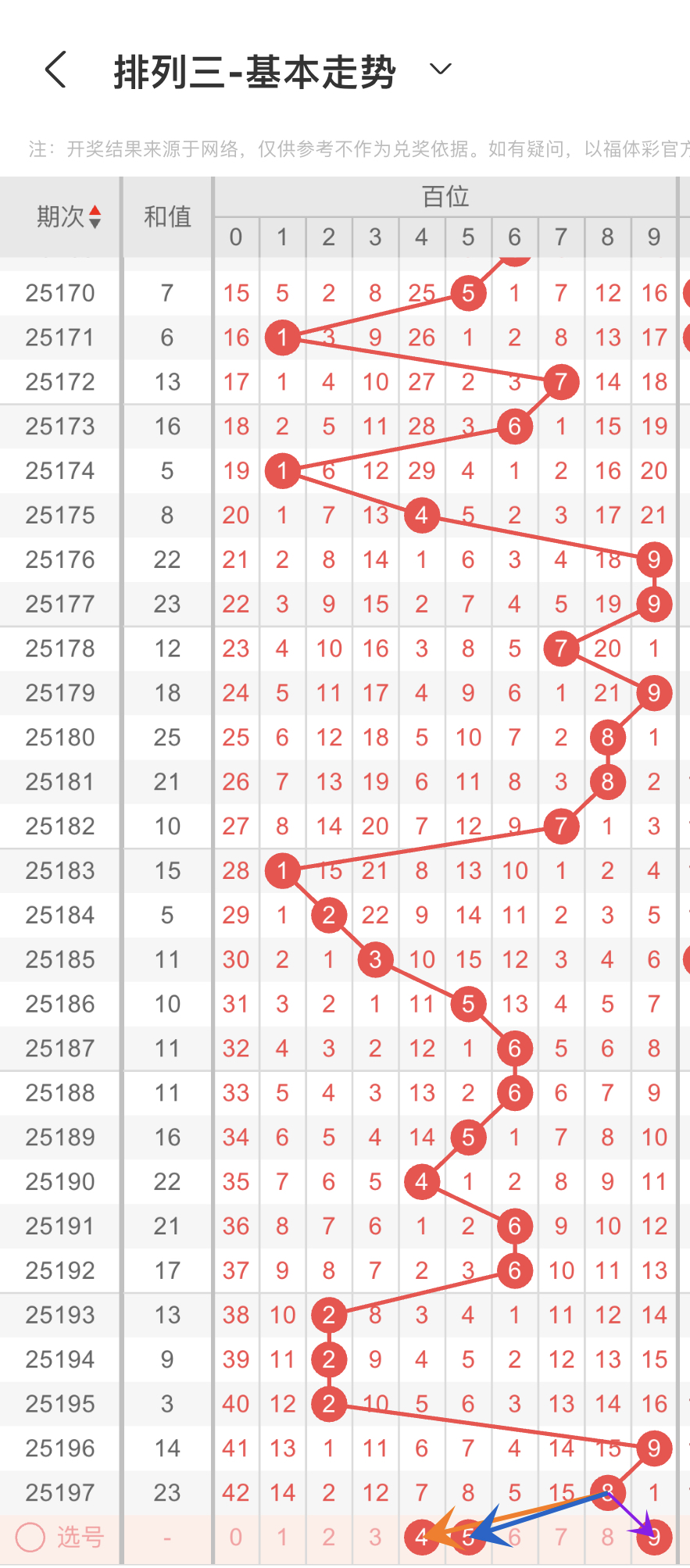 结合上面的大小、奇偶以及012路比,我们可以得到的数据分别是第一组56789,第二组13579,第3组258,我们重点选择3组数据中重复的,那百位我们选择5,防0路的9,1路的4,综上所述百位选459