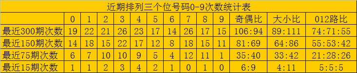 最近15期奖号由冷到热表现为:3、6→0次,1、7→1次,0、2、5、8、9→2次,4→3次,奖号奇偶比为6:9,大小比为7:8,012路比为4:5:6。