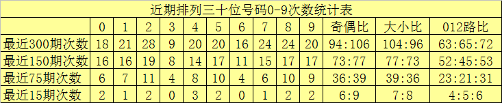 个位分析:最近300期奖号由冷到热表现为:9→21次,0→24次,5→25次,6→28次,8→30次,1→31次,4→34次,2、7→35次,3→37次,该位号码奇偶比为149:151,大小比为139:161,012路比为110:100:90。