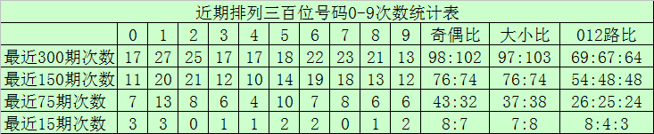 百位分析:最近300期奖号由冷到热表现为:0→20次,4→26次,5、9→28次,8→30次,3、6→31次,2→33次,7→35次,1→38次,奖号奇偶比为160:140,大小比为152:148,012路比为110:99:91。