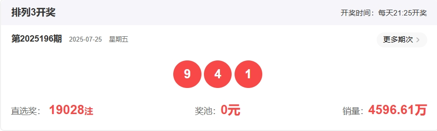 排列三第2025196期开奖回顾:开奖号码:941 形态:组六