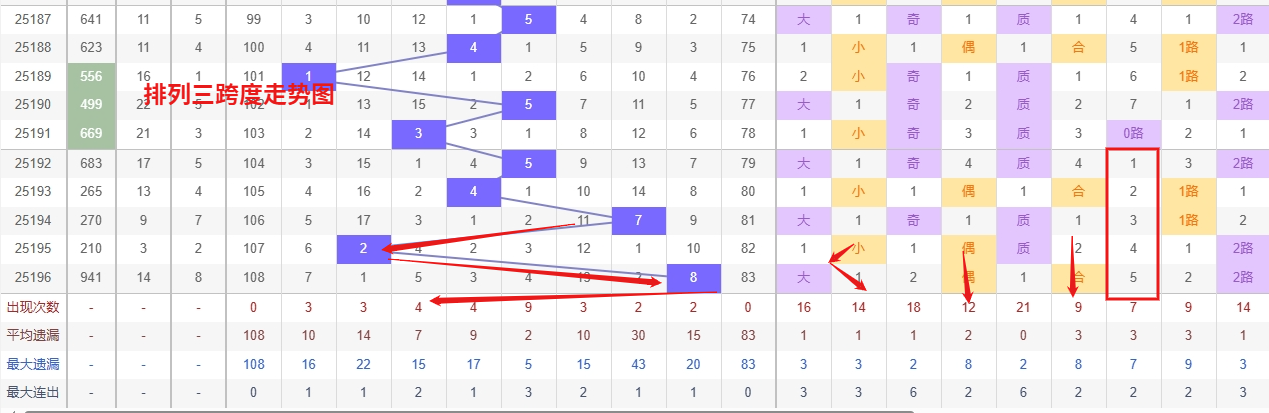 排列三 跨度分析:从上图可以看出近100期的跨度大小比约为55比45,跨度奇偶比约为51比49总体来看还是比较均衡的,但跨度大小之间有点差异。我们再从历史开出8跨后下一期4跨度数据来做参考。最近10期跨度大小比约为5:5近期开出小数跨度过多返回大数跨度的概率更高一点。历史开奖近2期出8跨以后的走势为092期开出8跨后下一期走4跨走出4振幅,第111期开出8跨后下一期走1跨走出7振幅第125期开出8跨后下一期开出6跨走出2个振幅。连续多期大振幅。近期排列三跨度走势呈现分化趋势,其中1跨和6跨表现温和,但已有转热的迹象,值得重点关注。1跨作为小跨度代表,近期虽未频繁开出,但遗漏值逐步攀升,回补需求增强,尤其需防范其以组三形态反弹。6跨近期温和走强,开始呈现活跃态势,可适当关注其中等跨度组合。与此同时,4跨作为近期热号,持续保持高开出频率,短期内仍需防范其惯性走强,尤其是搭配奇偶组合的可能性。在策略上,采取"守热追温"的思路,优先关注4跨的持续热度,同时密切跟踪1跨和6跨的升温趋势,综合以上分析后得出,本期预计跨度遵从历史会走出大振幅,出8跨度后容易走出2到5个跨度振幅的对称形态,跨度走出2到5个振幅看好的跨度有1467跨,所以第2025197期排列三跨度推荐1467跨。