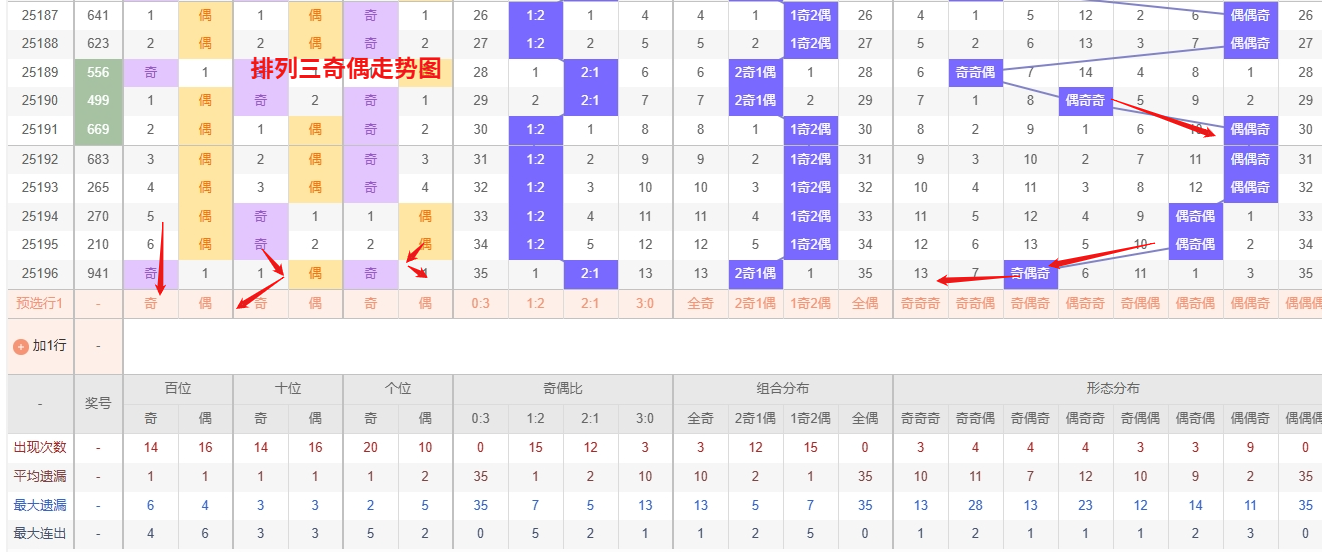 排列三 奇偶分析:从上图可以看出排列三100期内百位奇偶比约为48比52,十位奇偶比为54比46,个位奇偶比为49比51,个位的比值比较均衡,但是十位的比值偏差就有点大,历史奇偶形态近2期开出奇偶奇后下一期的走势为,第106期开出奇偶奇后107期开奇奇奇, 第112期开出奇偶奇后第113期开奇偶偶,第126期开出奇偶奇后第127期开偶奇奇。近期排列三奇偶走势呈现明显分化,其中"奇奇奇"和"奇偶偶"组合近期虽未频繁开出,但遗漏值逐步攀升,走势逐渐升温,有转热的迹象,需重点关注其回补可能。尤其是"奇奇奇"形态,在历史数据中往往呈现周期性爆发,而"奇偶偶"组合近期温和走强,可适当关注其搭配小跨度组合。与此同时,"偶奇奇"作为当前热号,近期持续高开,呈现较强的热度,短期内仍需防范其惯性走强,特别是搭配中段号码的形态组合。从策略来看,采取"守热追温"的思路,优先盯防"偶奇奇"的持续热出,同时密切关注"奇奇奇"和"奇偶偶"的升温趋势,所以排列三2025197期奇偶形态推奇奇奇与奇偶偶。