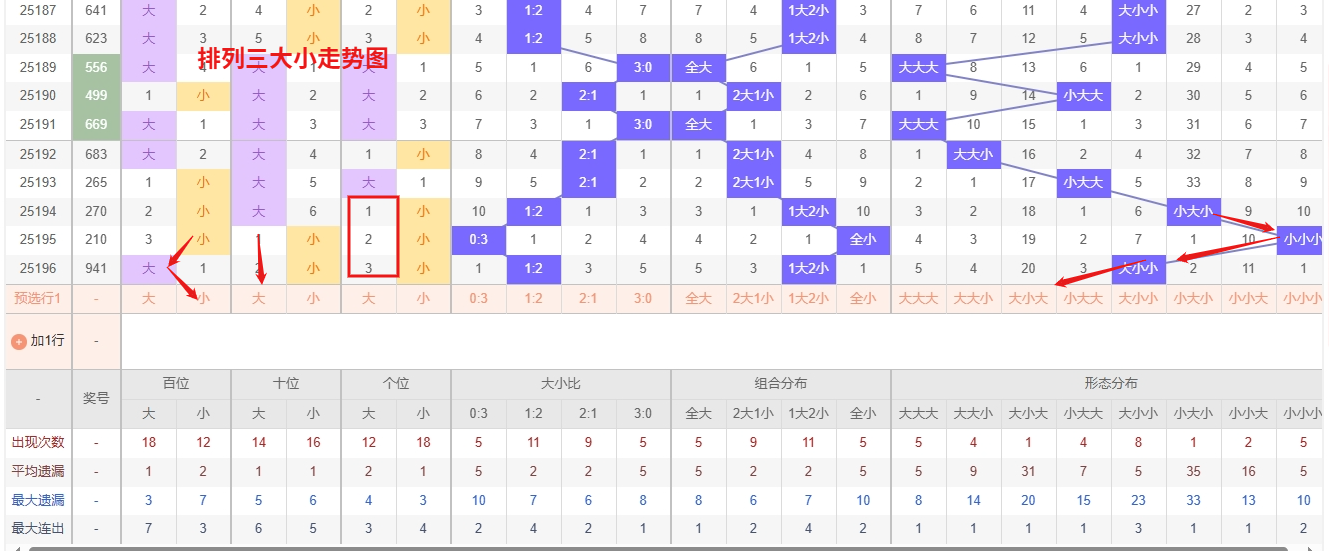 排列三 大小形态分析:从大小走势图上可以看出排列三100期内百位大小比约为52比48,十位大小比约为45:55,个位大小比约为51比49,除了十位奇数比偶数多,百位和个位是偶数比奇数多。历史数据近2期开出大小小下一期的走势为,第091期开出大小小第092期开小大大。第103期开出大小小后第104期开大大大,第112期开出大小小后113期开大小大。近期排列三大小走势呈现明显分化,其中"小大大"组合持续高热,成为当前最热门的大小形态,短期内仍需重点盯防其惯性走强,尤其要关注百位小数(0-3)搭配十位、个位大数(5-9)的组合模式。而"大小大"形态则持续低温,已进入深度冷态,按照冷号回补规律,近期需重点防范其突然反弹,特别是百位中数(4-6)搭配"大小大"结构的组合。从历史数据来看,大小形态往往呈现"热者恒热、冷极必出"的特点,采取"追热防冷"的投注策略,在重点关注"小大大"热态延续的同时,适当布局"大小大"的冷态回补。所以排列三第2025197期大小形态推荐小大大防大小大。