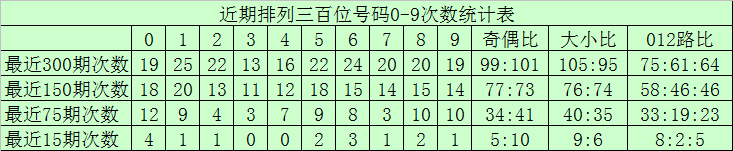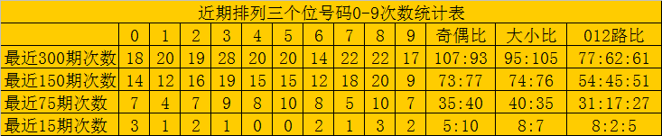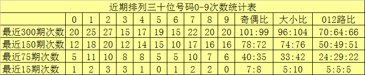 个位分析:最近300期奖号由冷到热表现为:9→23次,6→24次,0→27次,5、8→29次,1→30次,2→32次,7→33次,4→35次,3→38次,该位号码奇偶比为153:147,大小比为138:162,012路比为112:98:90。