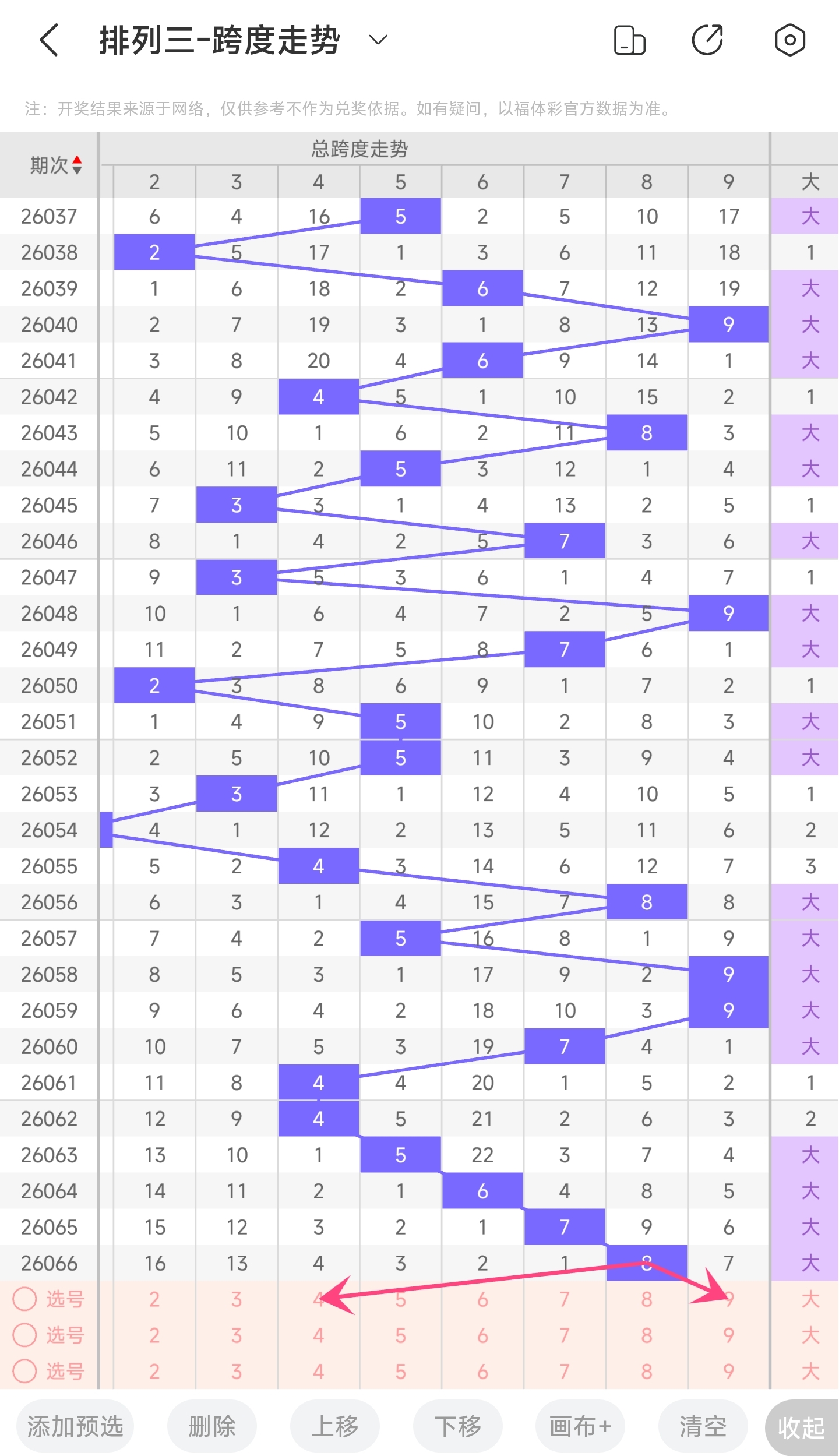 上期跨度为8,往前一期跨度是7,趋势往左移动,偏移量为1。跨度值8时,跨度值是近30期开出比较大的值。通过走势图分析,目前的趋势是大概率往左,小概率往右。所以推测本期跨度可能为34569等跨度。