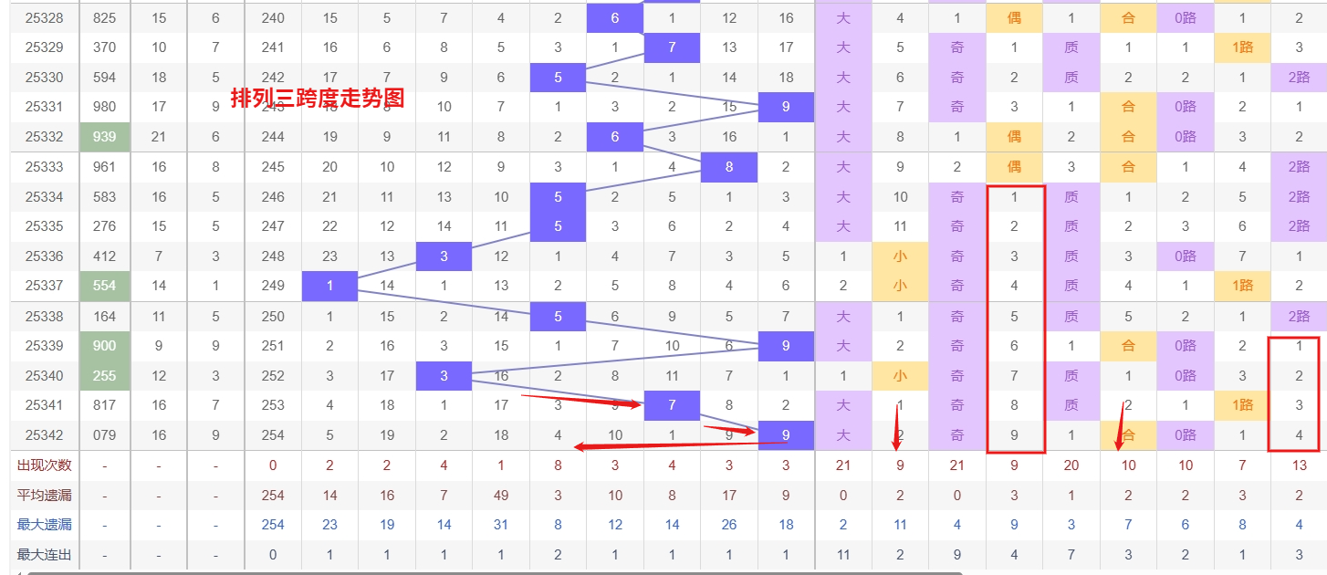 排列三走势分析:从上图可以看出百位号码连线走势到小偶数0,近10期内大数小数之间基本均衡,近期小数空缺较多有走向小数的势头。上期开出奖号0,回补了大偶数2路号码的不足符合我们的预期。前10次百位开出奖号0之后,其下期分别开出码:883599952,其中号码奇偶比约为4:6,大小比约为5:5,近期排列三百位走势来看,数字5和9呈现出明显的热态,尤其是5号频繁开出,已形成较强的热度趋势,短期内存在继续连开或交替走强的可能。而数字9同样处于活跃区间,热号之间的相互带动可能使其热度延续,需重点关注其惯性表现。与此同时,百位上的数字6已遗漏较长周期,逐渐进入冷态阶段。根据号码均衡分布规律,冷热转换是常见现象,尤其当某一号码冷至一定程度时,其回补概率将逐步上升。因此,在追踪5、9等热号连下机会的同时,也应警惕冷号6的突然回补,本期该位注意号码:24569,排列三十位走势上近期小数一直占据上风比较强势且出号热区一直处于小数,回补了一期小数后有返回大数的可能,第2025342期开出大奇数7。近期排列三十位走势来看,数字3和5目前处于温号区间,出现频率稳定且略有升温势头,观察其遗漏节奏与回补轨迹,两者均显示出蓄势上攻的迹象,有望在短期内由温转热,形成阶段性活跃态势。而数字9则已进入明显的冷态周期,遗漏值逐渐扩大,在适当关注3和5的升温趋势、捕捉其潜在热出机会的同时,也需对冷号9进行策略性防守 ,所以第20253043排列三十位看好03459,个位经过2期的偶数回补后走奇数的可能开出号码9符合我们的预期,本期有走偶数的迹象。连线走势上到大奇数9,0路号码奇数,近期排列三个位走势来看,数字8表现强势,已进入明确的热态周期,短期内呈现高频开出的特征,这种趋势往往具备一定惯性,需关注其继续热出的可能性。与此同时,个位数字1已遗漏较长周期,处于明显的冷态阶段,所以排列三第2025343期个位推荐12368。本文由一起彩钱是生命动力所著,请勿转载