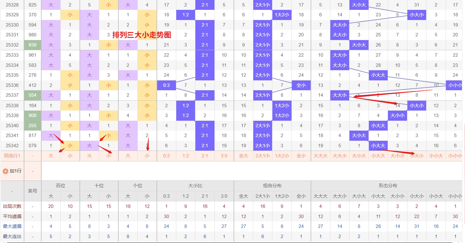 排列三 大小形态分析:从大小走势图上可以看出排列三100期内百位大小比约为51比49,十位大小比约为47:53,个位大小比约为52比48,除了个位和百位奇数比偶数多,十位是偶数比奇数多。历史数据近2期开出小大大下一期的走势为,第275期开出小大大第276期开大小大。第287期开出小大大后第288期开大小小,第292期开出小大大后293期开小小小。近期排列三大小形态走势来看,大小大持续热出,已形成明显的热态趋势。这种活跃形态在短期内往往具备一定的惯性,不排除继续连开走强的可能。与此同时,小小小已遗漏多期,进入深度冷态阶段,其遗漏值正逐步逼近理论回补的临界点。尽管全小组合在整体出现频率上相对偏低,但冷态越深,其反弹的潜在动能也越强,需重点防范其突然解冻回补。关注大小大热态延续的同时,也需对小小小冷态进行适当防守,所以排列三第2025343期大小形态推荐大小大防小小本文由一起彩钱是生命动力所著,请勿转载