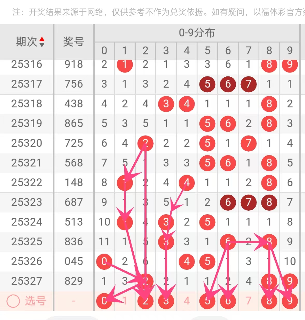数字“0”在前四期仅出现一次(第4期百位),处于相对低温状态。然而,从历史走势观察,“0”具有典型的“冷后突热”特征,即经过短暂遗漏后常会迅速反弹,甚至形成短周期内的密集出现。目前,小号区间(0-4)在整体出号中占比偏低,存在较强的回补预期。作为小号区的代表之一,“0”不仅具有位置上的灵活性(常出现在百位或个位),也往往在区间转折时率先表现。因此,本期可关注其作为冷热转换的突破口。